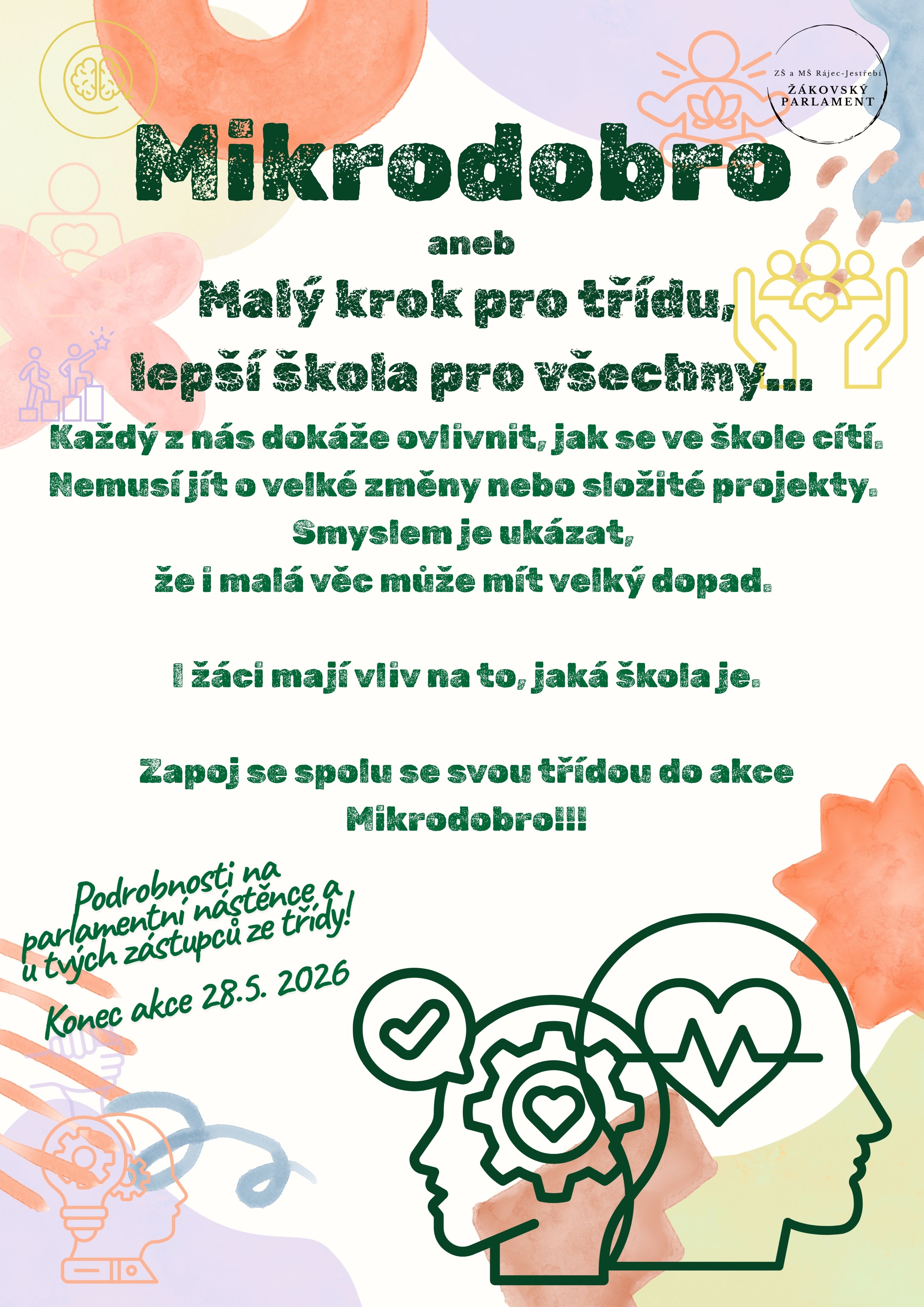Škola je místem, které vytváříme společně – svým chováním, přístupem i drobnými každodenními věcmi. Proto bychom vás chtěli motivovat k další akci. V akci Mikrodobro, jde o to, že si každá třída vybere jednu konkrétní věc, kterou může přispět k tomu, aby se ve škole cítili lépe všichni.